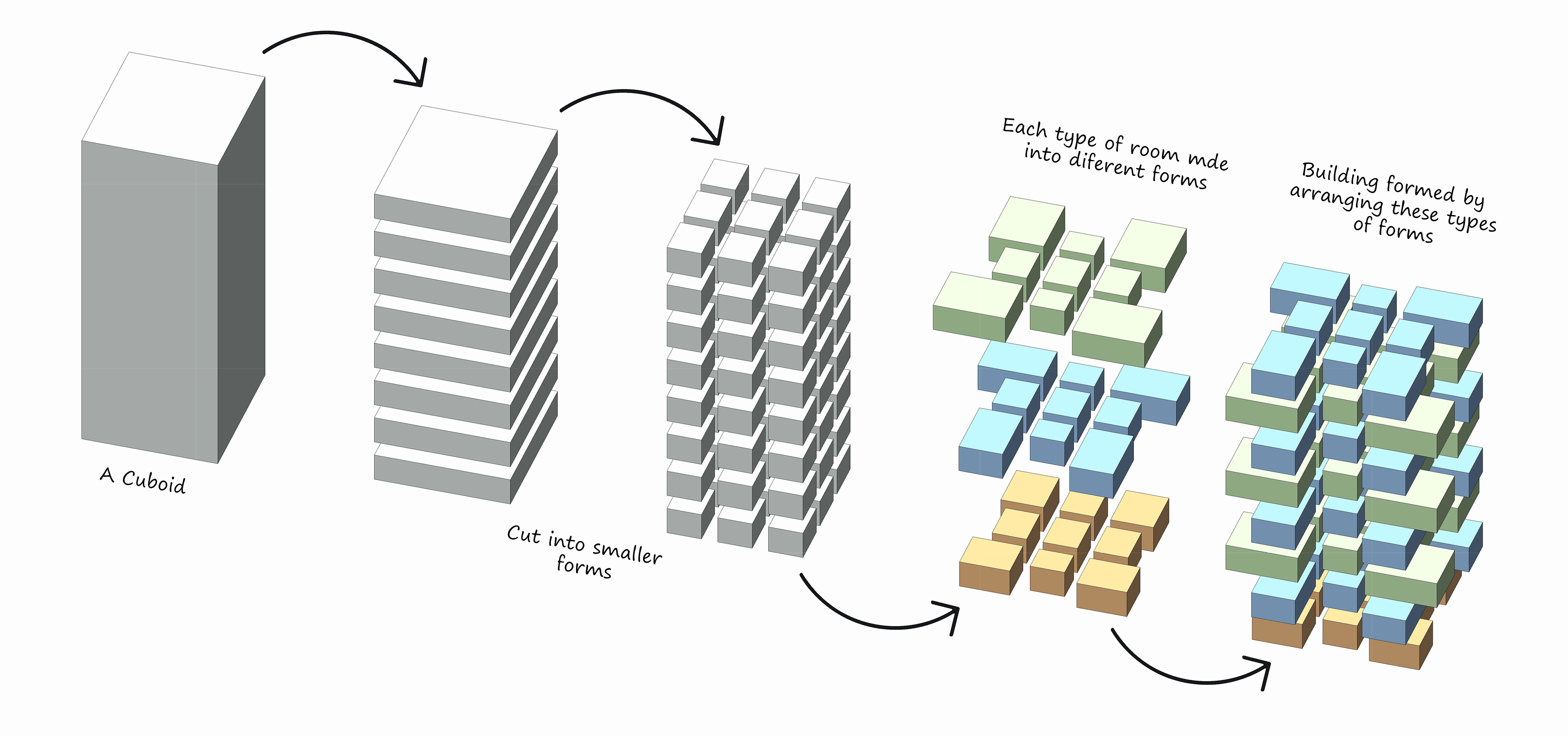 The evolution begins with a simple, large cuboid mass — representing the basic volume of the apartment block. From this primary form, smaller cuboids are extruded outward to create distinct spatial pockets for rooms such as bedrooms, kitchens, and balconies. Each extrusion is deliberate, not only breaking the monotony of the building’s envelope but also enhancing functionality by allowing more light, ventilation, and privacy to these spaces.