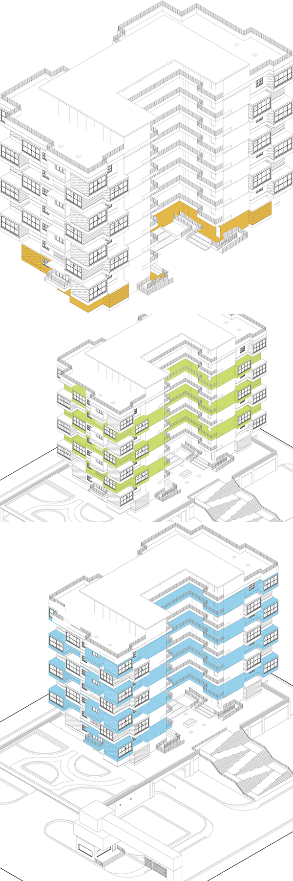 In essence, the form of Jenga Heights evolves from a uniform mass into a lively composition of interlocking volumes — a thoughtful blend of playfulness and purposeful design.